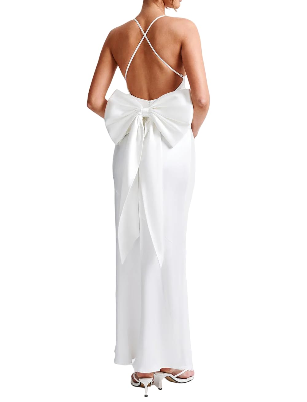 • White Satin Deep V Open Back Bow Slim Maxi Dress