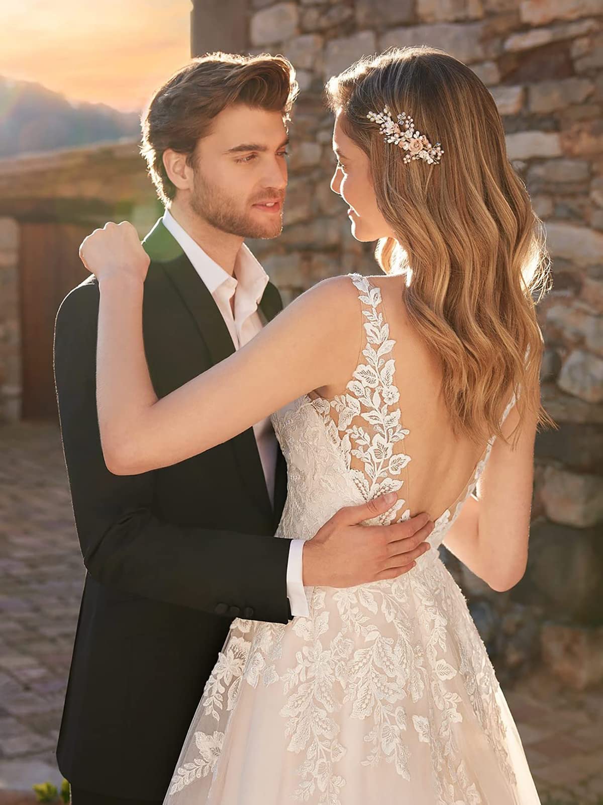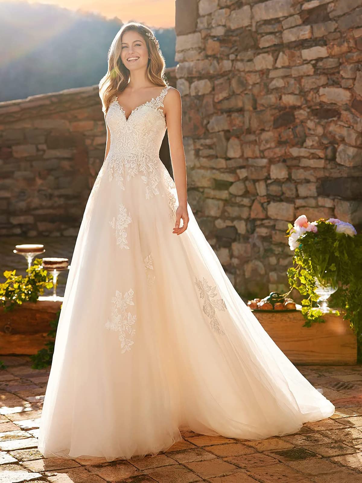 A romantic interweaving of V-neck and lace: The deep V-neckline elegantly reveals the neck and décolletage, minimizing the visual burden on the shoulders and neck while conveying a dual aura of “elegant, sexy, and ethereal femininity.” The bodice is embroidered with couture lace, and the floral pattern, like delicate vines in the moonlight, imbues the dress with a vintage romance, instantly capturing the eye and effortlessly fitting into a “lightly retro + fairy-like” wedding style.