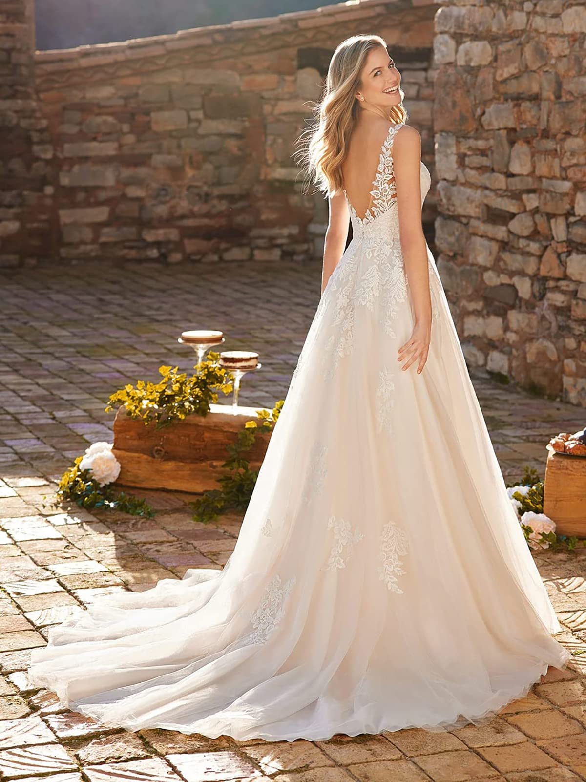The train is streamlined and neatly cut, and the length is in perfect proportion to the overall silhouette, allowing for a graceful flow when walking and a cascading, art-like drape when standing. Every detail showcases the craftsmanship of a couture wedding dress.