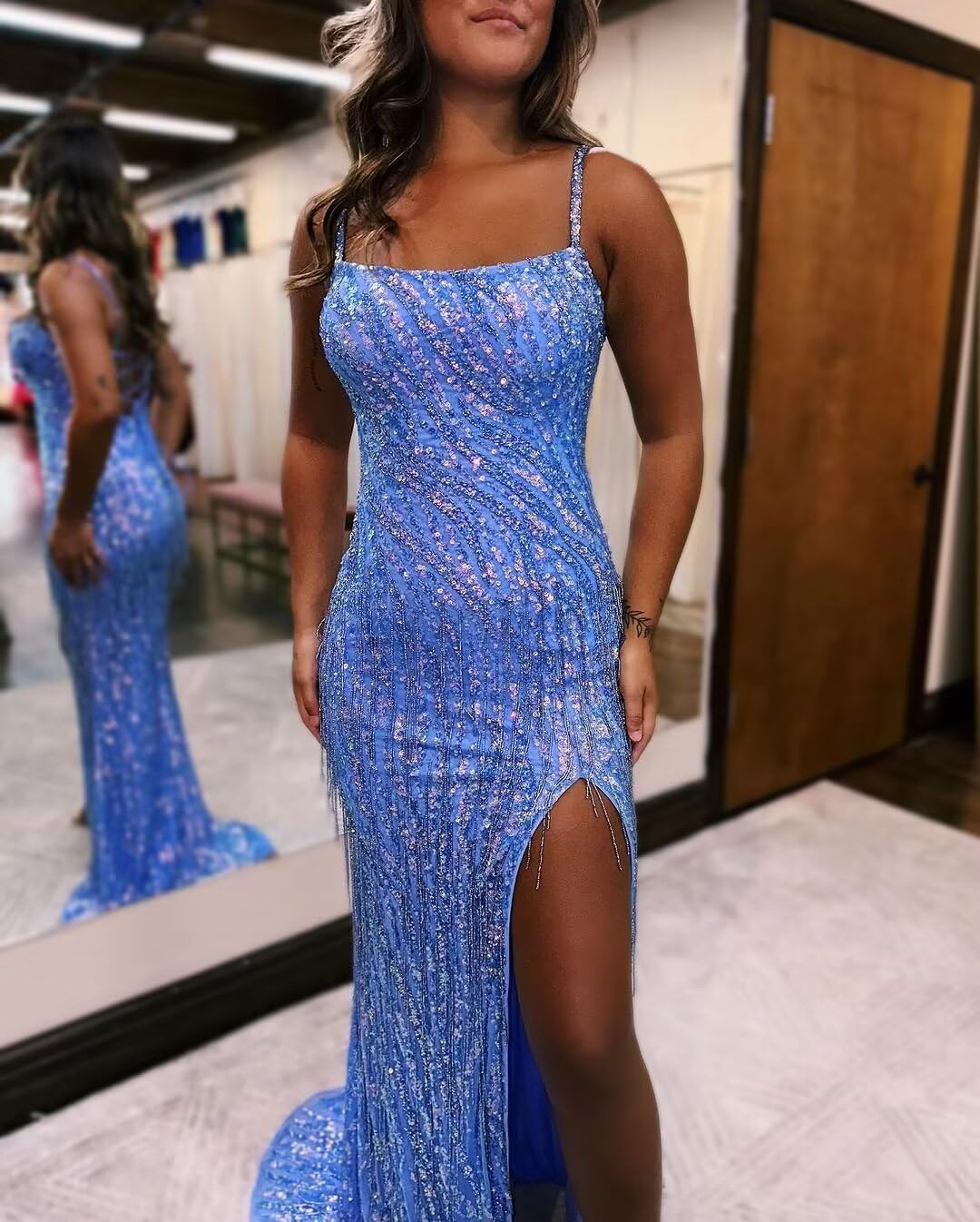 A dazzling combination of straps and sequined tassels: The thin straps elegantly reveal the shoulders, neck, and collarbone, minimizing the visual burden on the shoulders while enhancing the slenderness of the neck and shoulders. The skirt is covered in dense sequins and draped with tassels. The ocean blue hue reflects the light like a flowing galaxy. The shimmering sequins and swaying tassels echo each other, creating a dynamic “shimmering” aesthetic as the dress walks, instantly attracting everyone’s attention.