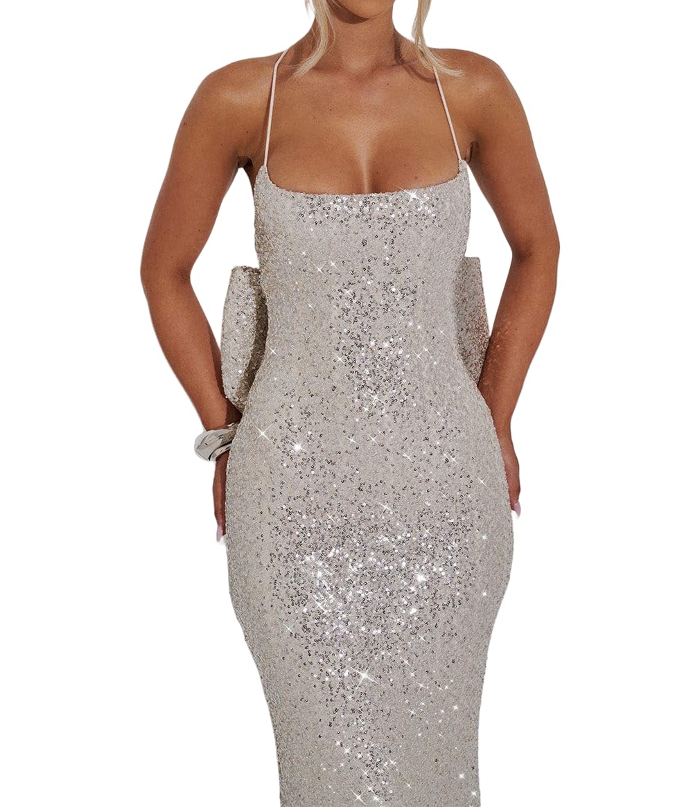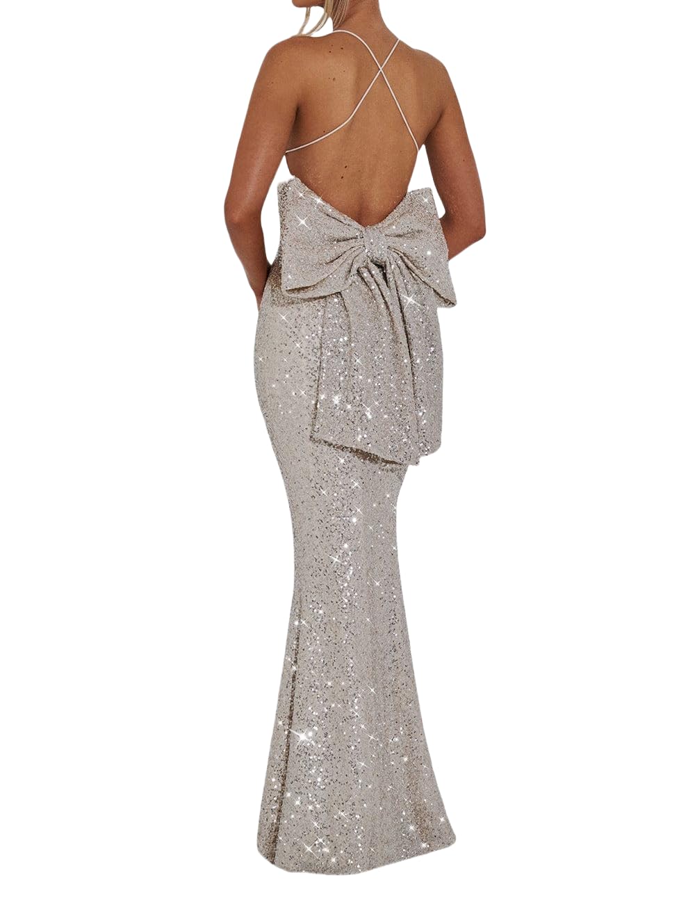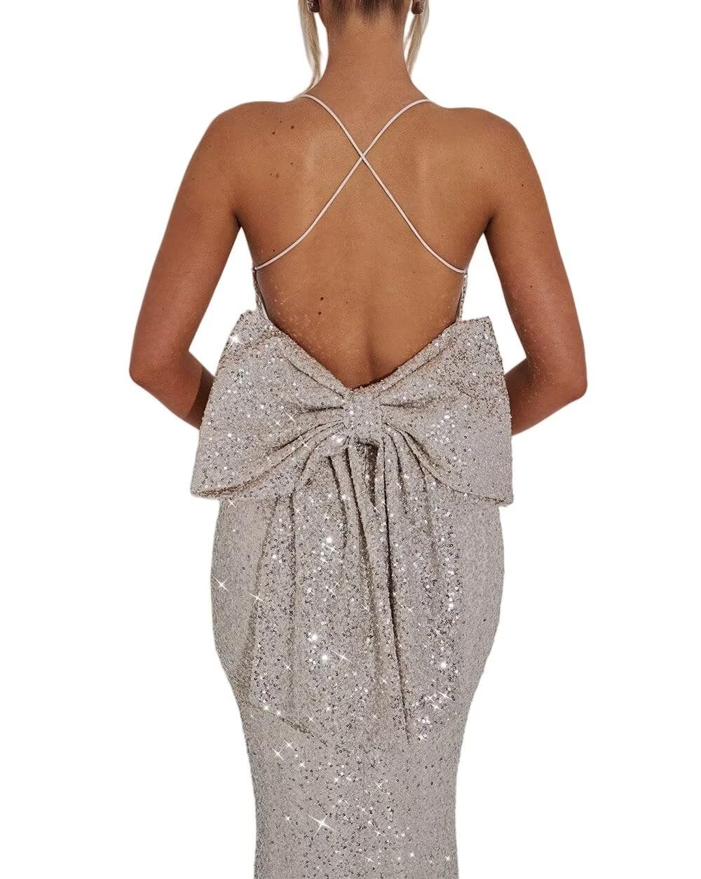 A large bow on the back adds a touch of romance: The oversized bow on the back is full and crisp, draping like an exquisite wedding knot, adding a touch of femininity to the cool sequined dress. It sways gently with movement, creating a subtle balance of sparkle and romance.