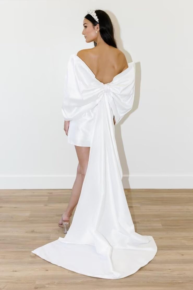 From the sexy backless look, the artistic bow, to the formal and refined satin train, this gown cleverly blends “simple sophistication” with “eye-catching design,” making it a must-have for creating a high-shine look.